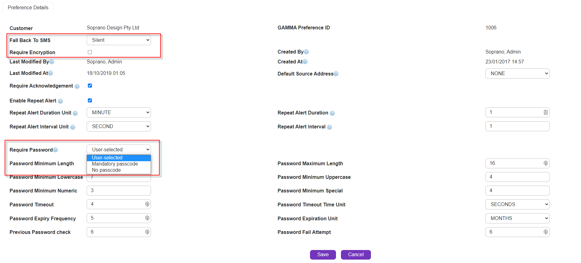 The key controls on the Customer GAMMA Preference page are as follows: