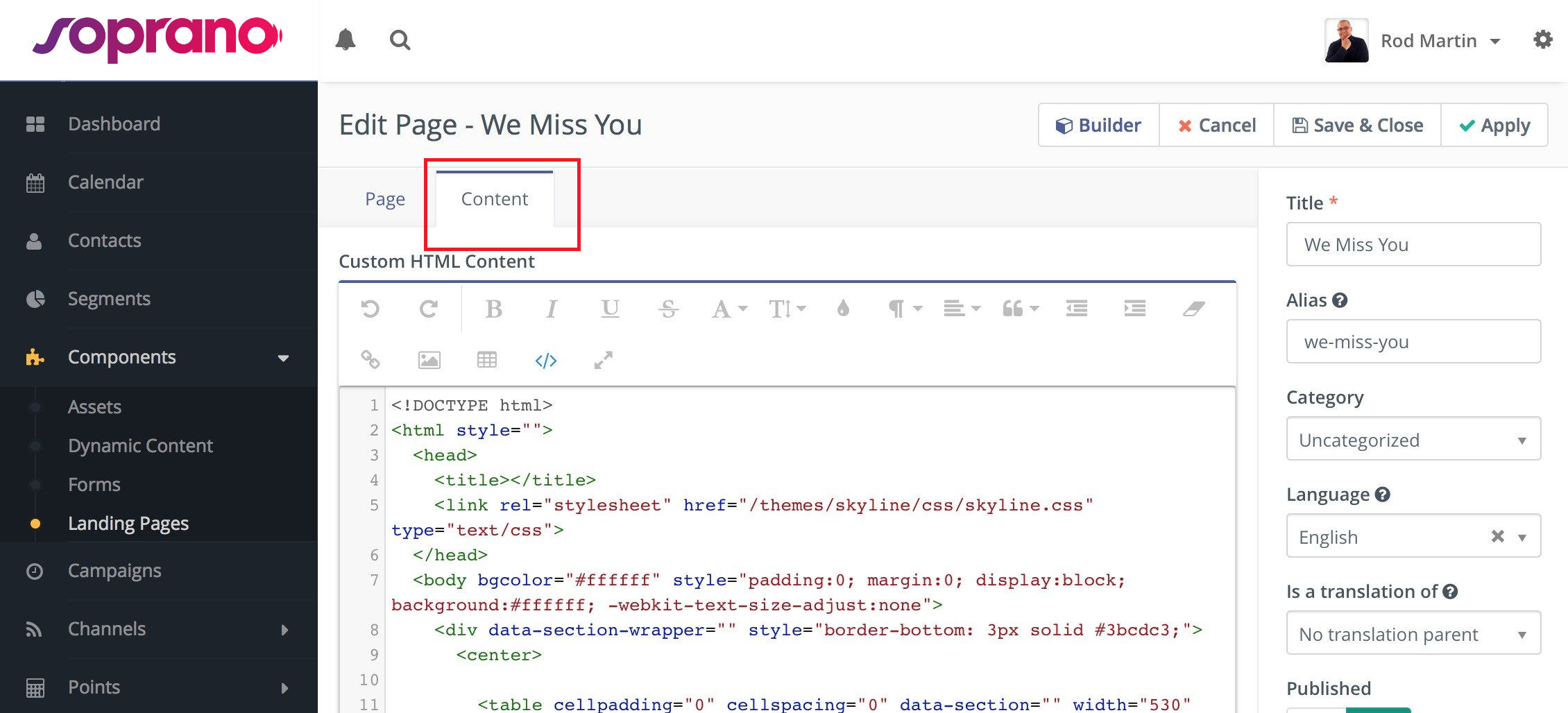 The page form allows Users to create new landing pages and offers a number of fields to be used. Users will notice most of them in the following screenshot (below). In particular notice the Page Builder button on the top toolbar. This is where Users will launch the page builder to easily create your page layouts.