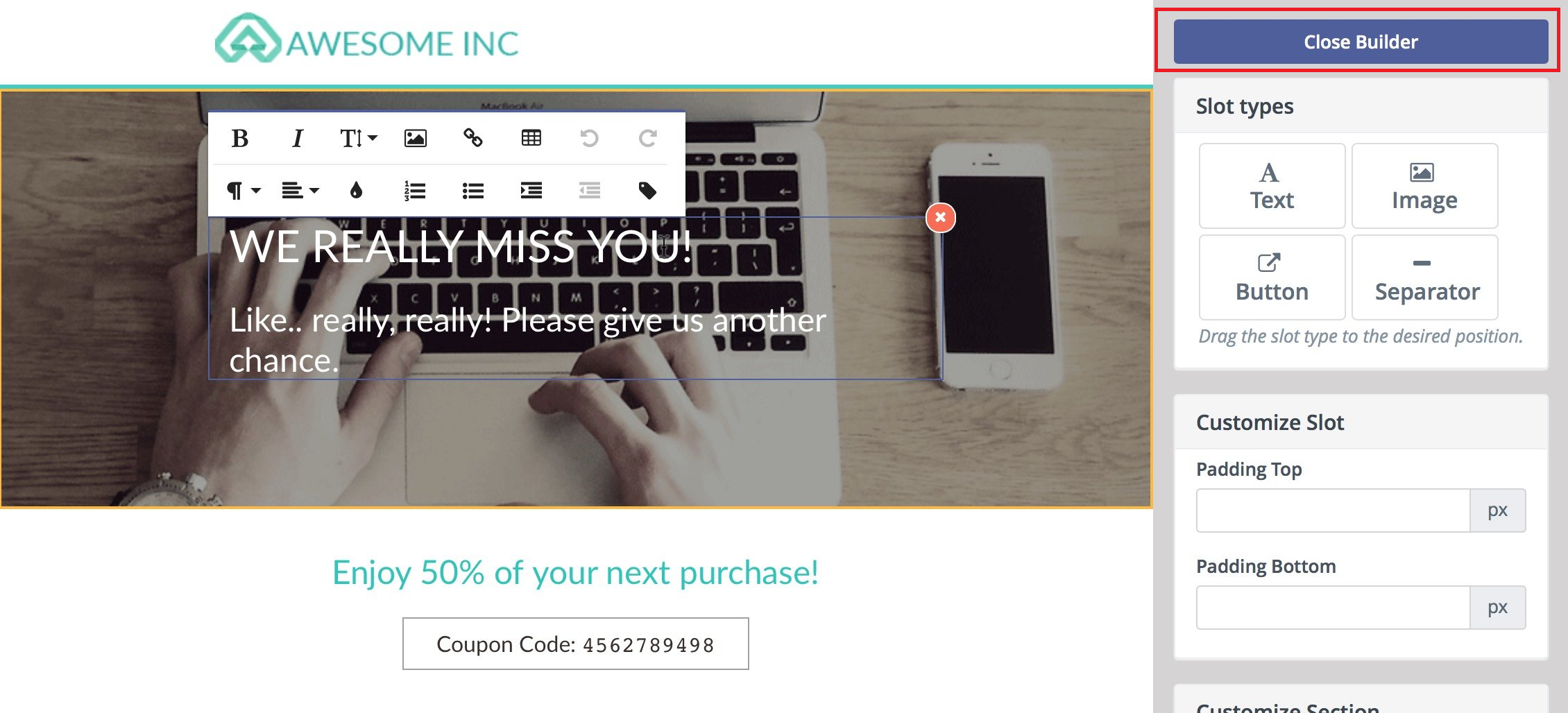 The builder will let Users drag the predefined content sections from the right hand toolbar and drop them to the position you choose. It's possible to select from layout of 1, 2 or 3 columns. The existing sections can be re-ordered or removed.