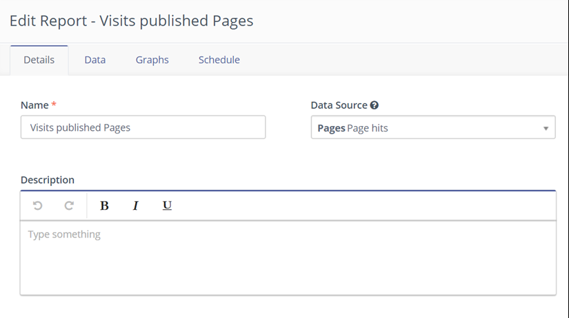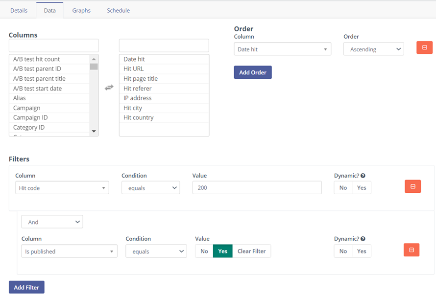 Choose the data source appropriate to the report required. Each data source has a different set of available columns, filters and graphs.