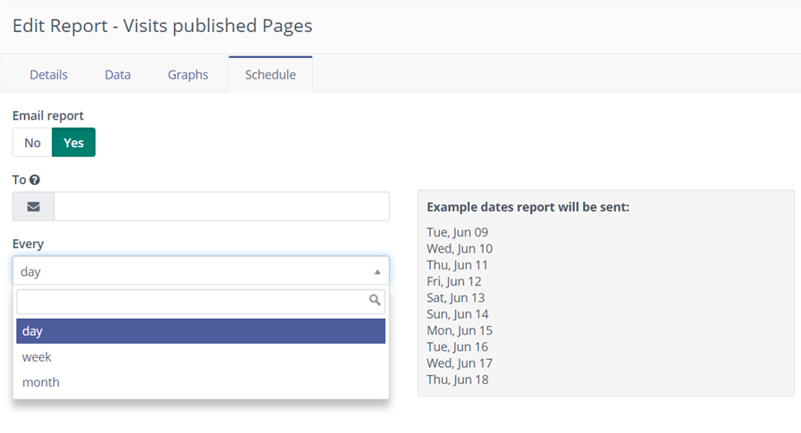 It is possible to schedule emails that will send reports to one or more email addresses. In the To field, enter a comma-separated list of email addresses and set the frequency of sending reports by choosing day, week, or month from the drop-down list.
