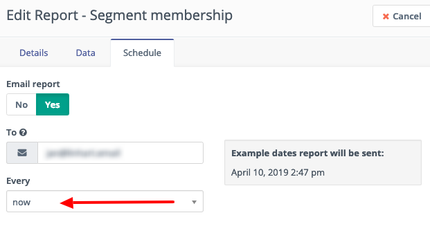 It is possible to send a report just once. This may be helpful if a report takes some time to load. The cron job will process the request, and send the result by email.