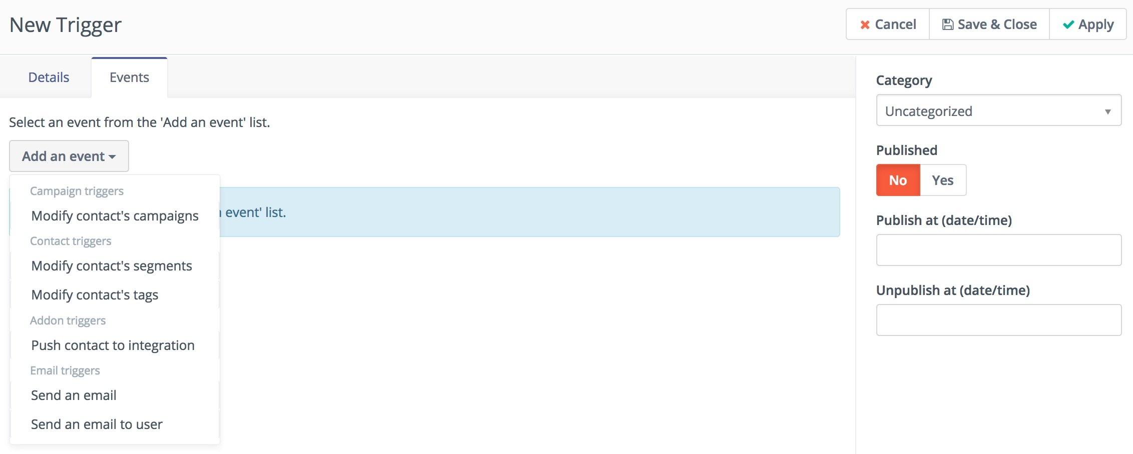 Point triggers are resulting events which are fired based on the achieved point total of a contact. In simple terms, when a contact reaches a minimum number of points, the point trigger is fired and an action is performed.
