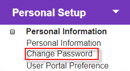 Click the 'Change Password' link in 'Personal Setup > Personal Information' to open the 'Change Password' screen.