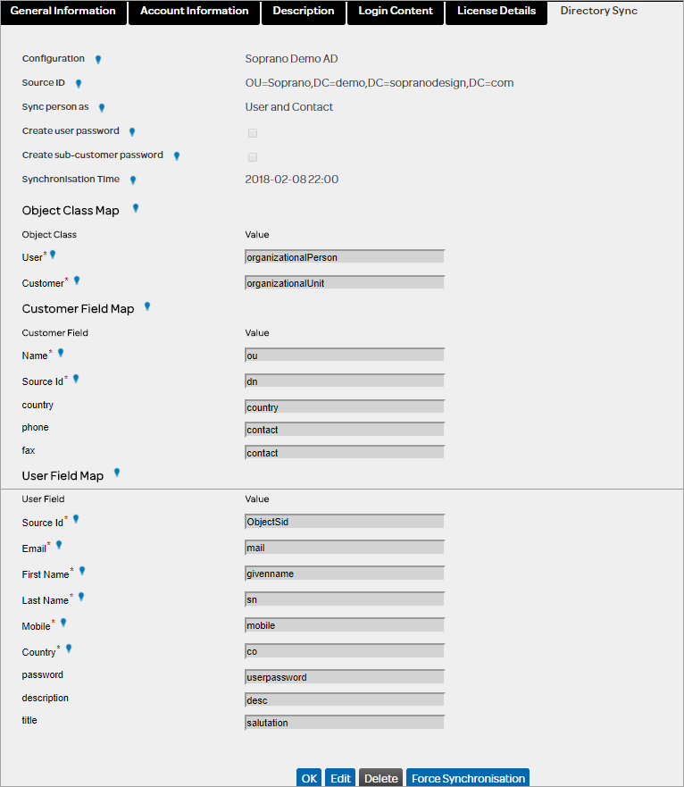 As a customer administrator with valid LDAP (Active Directory) Plug-in licences, you have privileges to set up synchronisation connectivity settings for your company directory. Once the sync-settings are created, admins must create mapping of these settings with entries i.e. at Customer or Sub-customer level. This is a one-time setup and once sync-items are created, SOPRANO MEMS runs synchronisation through LDAP (Active Directory) Plug-in periodically to update the directory.