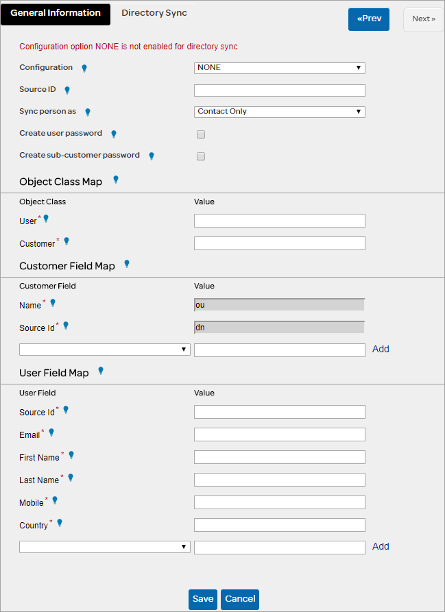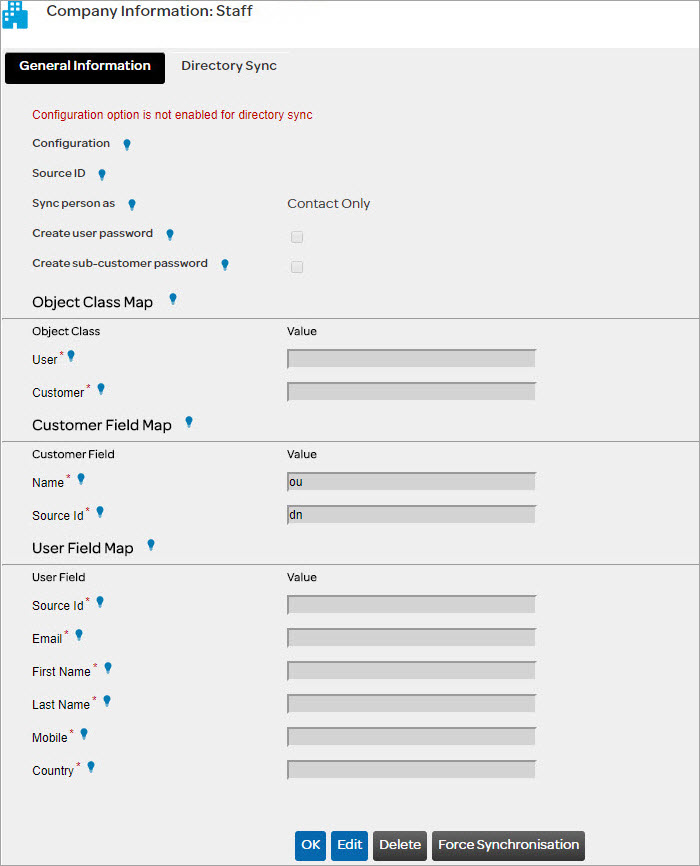 •Customer Synchronisation Source Id Attribute will always be ‘dn’ and is read-only. Customer Name Attribute will always be ‘ou’ and is read-only.