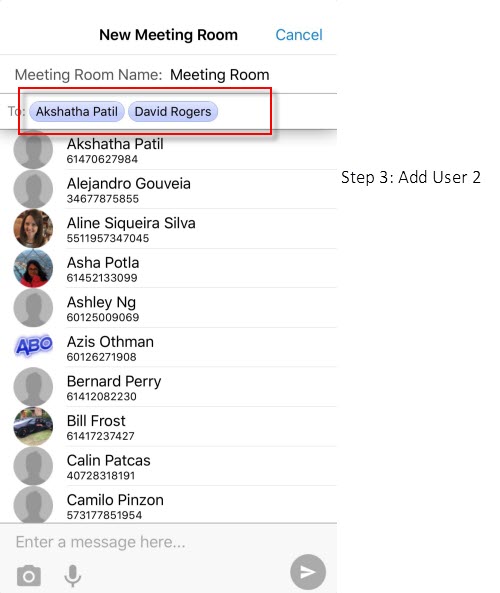 •Tapping on the Meeting Name will allow you to rename the meeting room. You can add more contacts by tapping on the Add Contact option. This will display your contact list and allow you to select who you want to add to the conversation.