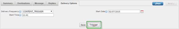 The delivery options tab allows you to select the timing of the delivery of any messages on this order. To link this order to your RSS Feed, select the CONTENT_TRIGGER option from the Delivery Frequency dropdown field. You can then set a start date and time for messages to be sent as a result of RSS content being received.