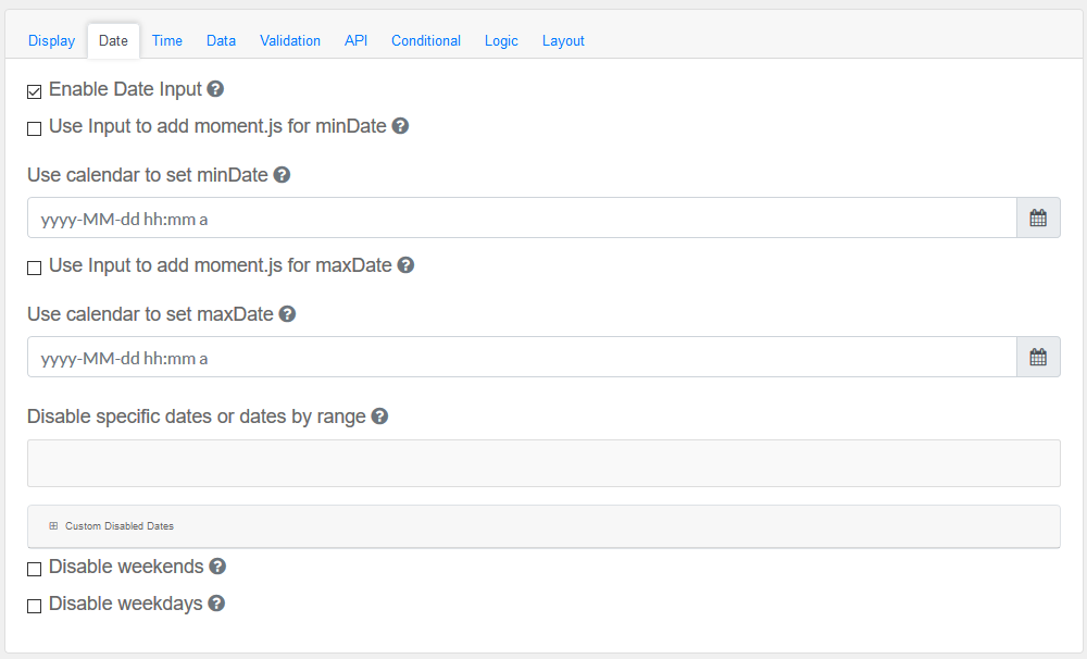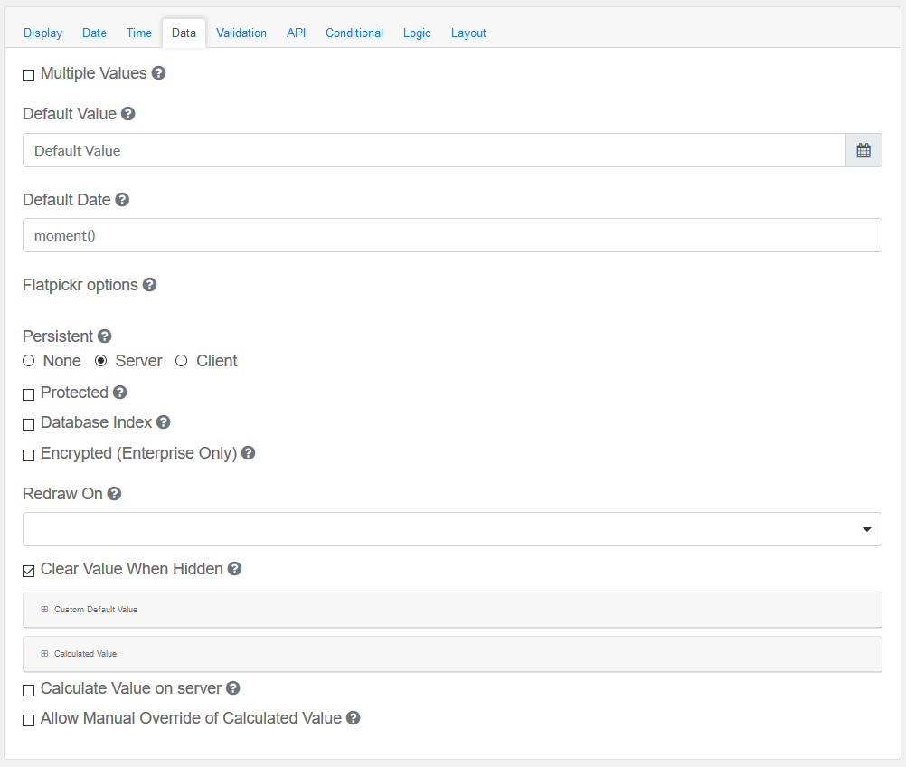 A raw JSON object to use as options for the Date / Time component (Flatpickr).