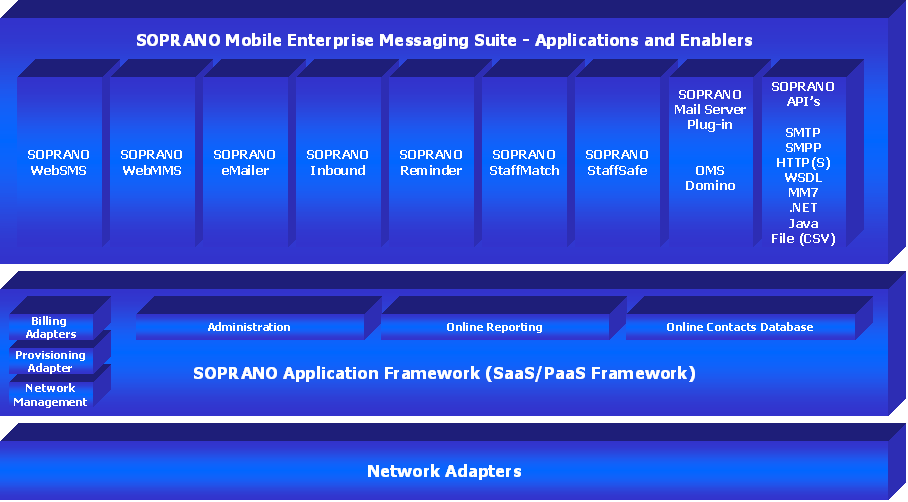 Build on tiered architecture SOPRANO Mobile Enterprise Messaging Suite incorporates SOPRANO's proven SAAS framework to provide rapid deployments of new applications whilst remaining both horizontally and vertically scalable.