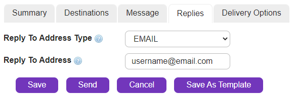 Select from the drop-down menu for each message type. If a recipient replies to your message, this is the method by which it will be received.