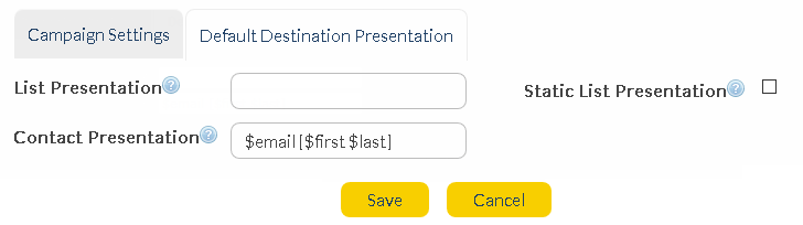 e.g. if '$first %last' values are saved in the 'Contact Presentation' field, the receiving contact's first and last names will be displayed instead of an email address in any related reports.