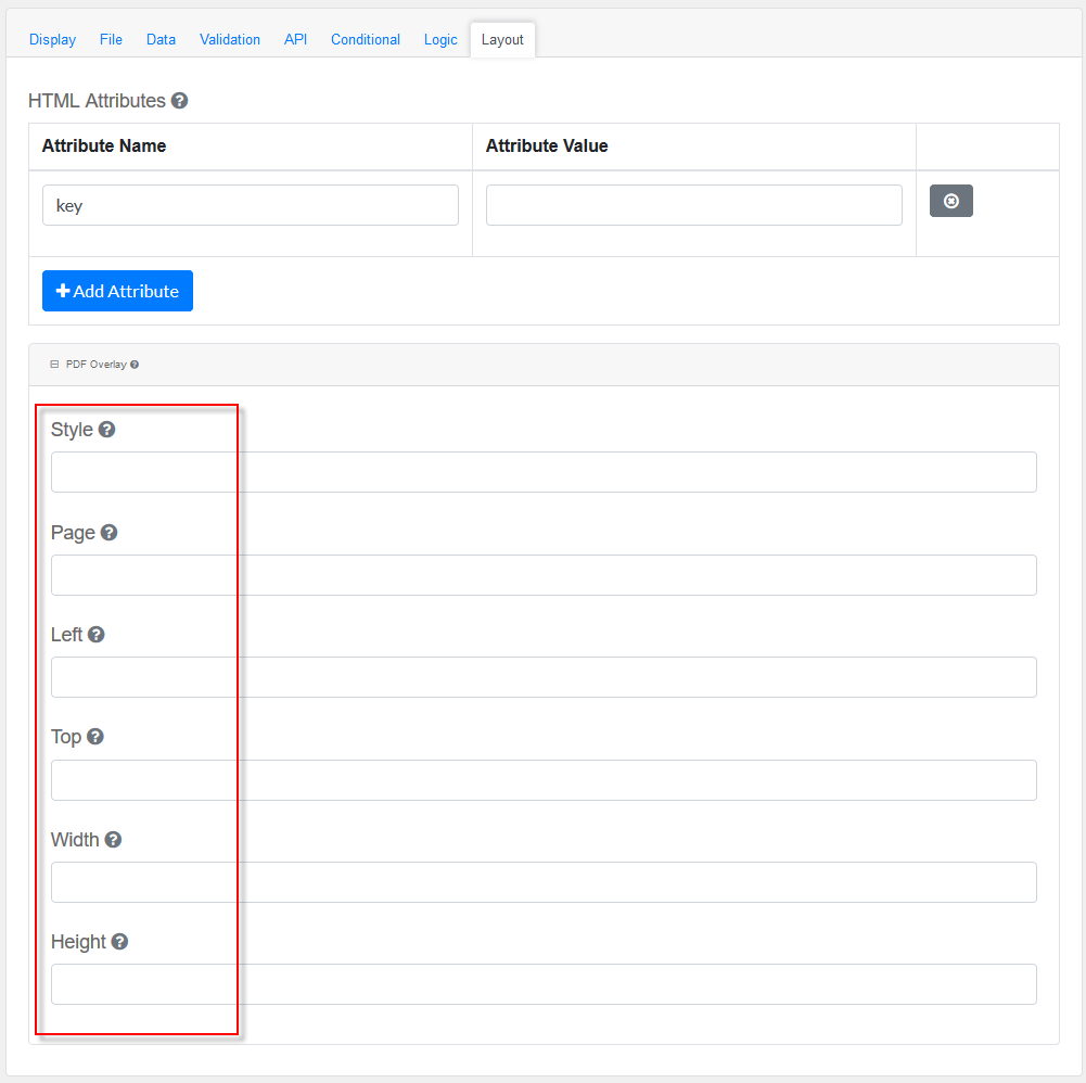 Note: Attributes provided by other component settings or other attributes generated by form.io take precedence over attributes in this grid.