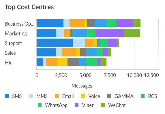 Top Cost Centres Displays message traffic statistics differentiated by separate cost centres, if these are being used. Sent messages in the statistics shall be including the messages with status Sent, Delivered, Failed, Expired.