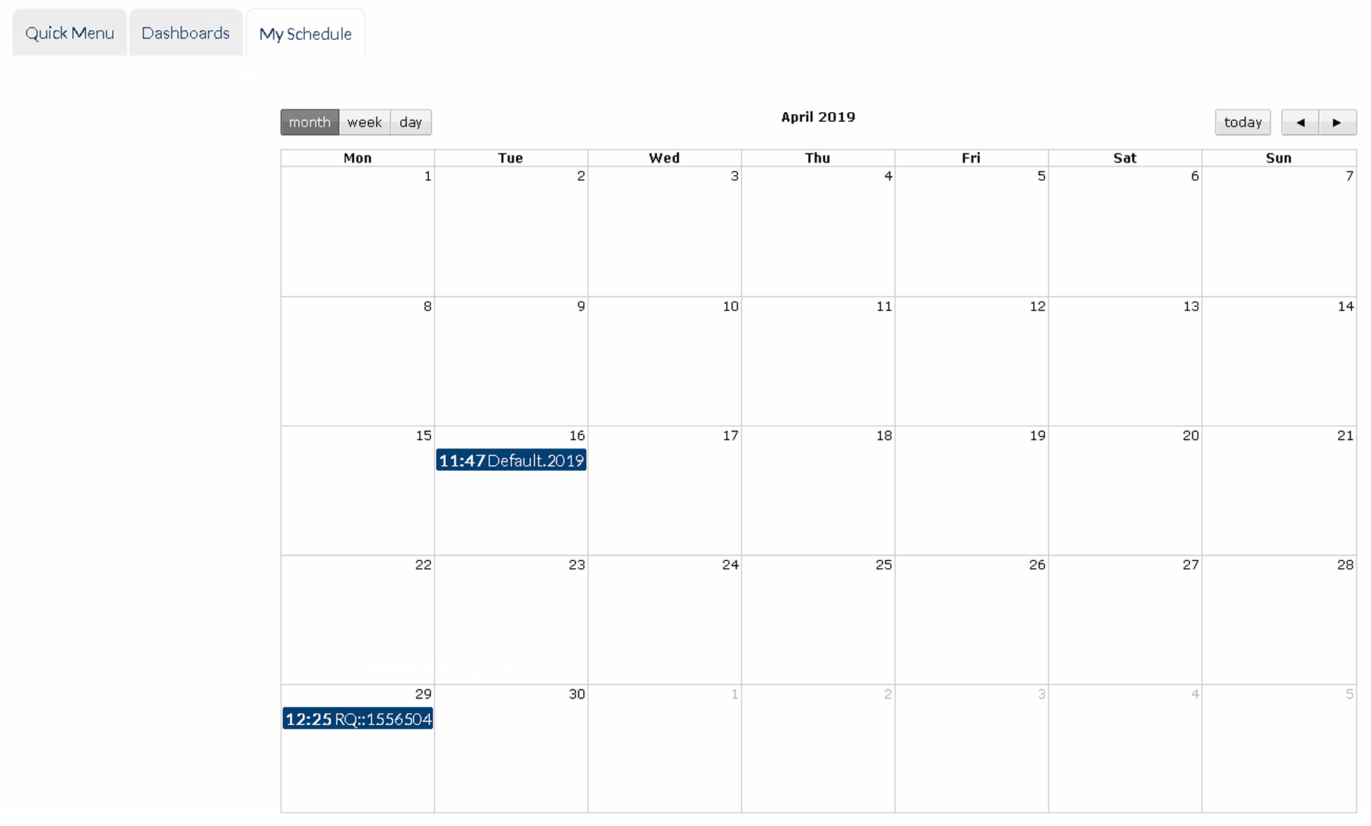 Calendar view of scheduled orders (e.g. SMS, Email - other types may be visible based on application licences held). This excludes scheduled reports. Times/dates are displayed according to the user's personal settings. Click 'Month', 'Week' or 'Day' to change view as required.
