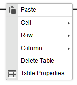 To edit the table, drag the columns or rows to resize them. Right clicking on the table brings up the table context menu which allows you to edit the rows, columns and cells (including merging, adding and deleting); delete the table; or adjust the table properties such as the cell borders, cell spacing and padding, and the table width and height.