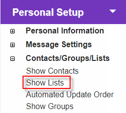 1. Click 'Show Lists' under 'Contacts/Groups/Lists' in 'Personal Setup' menu.