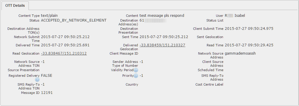 If your A2P account has been set up by the provisioning team for location collection AND the user has allowed the sending of their location to your account, then any A2P message sent to a user will display clickable map coordinates under the following headings: Delivered Geo-location and Read Geo-location.