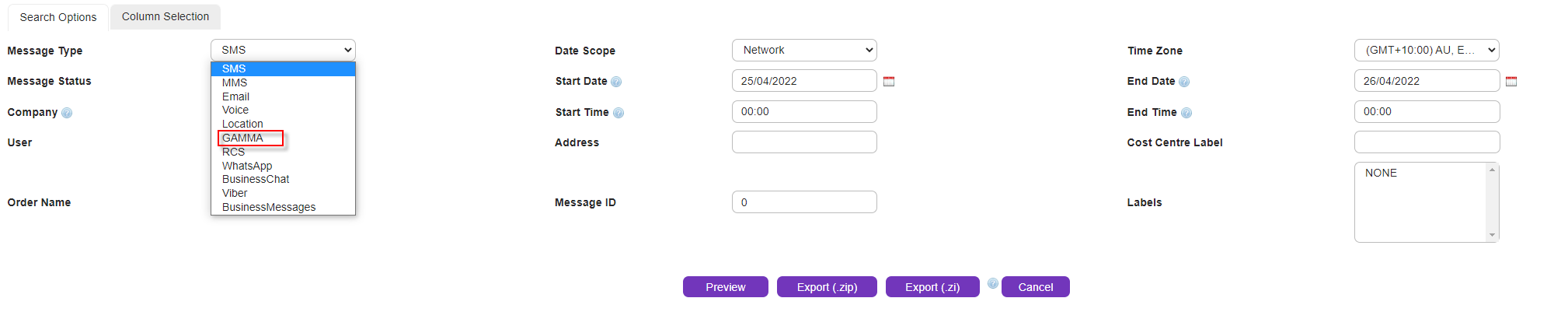 •Message Summary report screen is displayed. Select GAMMA as the Message Type and any other search criteria, as required.