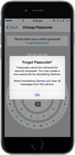 The GAMMA app provides a 'Forgot password' link every time a user is required to enter the password. On clicking the link, user is presented with the next steps indicating that new password can only be by reinstalling the GAMMA app. password cannot be retrieved for security reasons.
