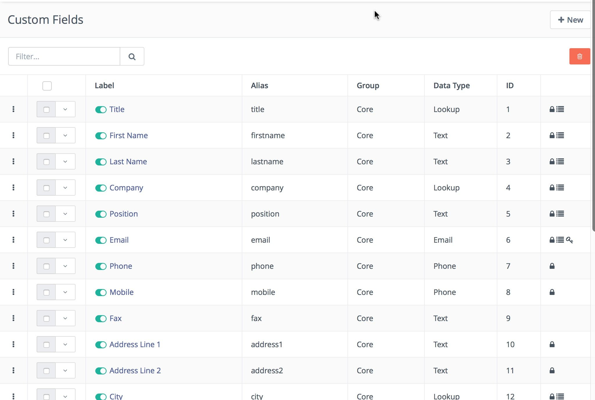 Users will notice the group column that shows where the specific field will be shown on the Contact profile. In the last column, Users may see several icons which signify various properties of the field: