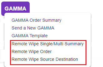 For A2P remote wipe, Click the GAMMA tab at the top of the user interface portal to open the GAMMA drop-down menu. Select the desired Remote Wipe option.