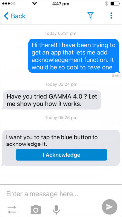 Require Acknowledgment provides a mechanism to send back active acknowledgment to the sender for indicating that the message has been read. It provides efficient way of tracking the status of important messages. If 'Require Acknowledgment' is enabled by a sender in Delivery Options while sending the A2P message, recipient will be presented with an 'I Acknowledge' button. On tapping the button, the status is changed from Read to Acknowledged.