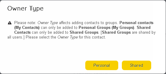 You will be prompted to choose whether the contacts are 'Personal' (contacts belong to the current user) or 'Shared' (contacts can be accessed by any users belonging to the parent customer).