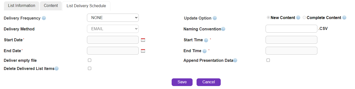 •Complete Content - When a list is updated via scheduled delivery, the full content will be replaced.