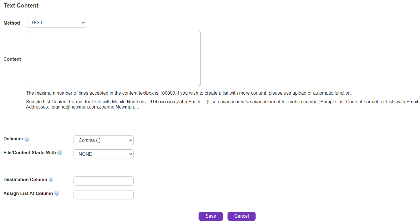 List data can be typed/pasted directly into the 'Text Content' field (Note: maximum number of lines accepted is 100,000).