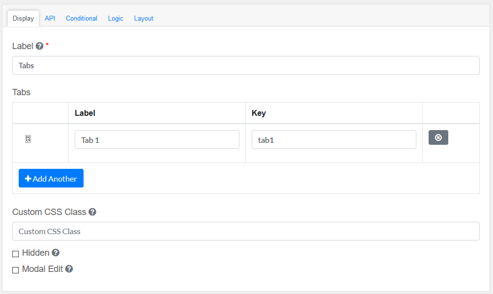 This section provides a map of Tabs attributes for a component's input element. Note: Attributes provided by other component settings or other attributes generated by form.io take precedence over attributes in this grid.