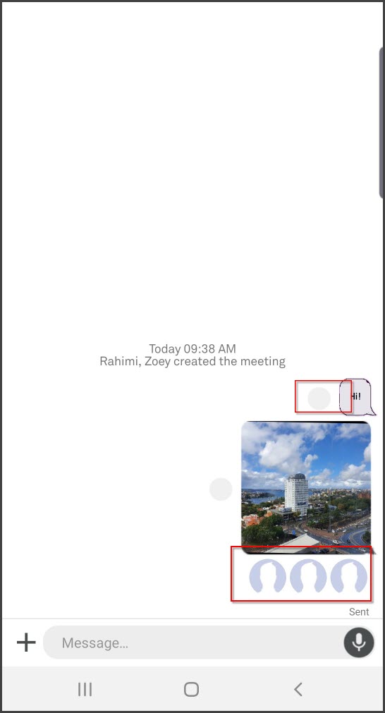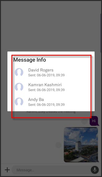 Tapping on the status indicator pie brings up a pop-up with the meeting room participant's avatar indicating if the message has been "Sending or Sent", "Delivered" or "Read". |