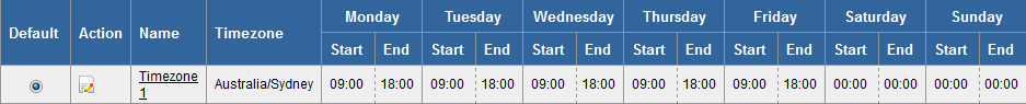 Click the 'Timezone Open Hours' link in 'Company Setup > Customer Information' to open the 'Timezone Open Hours Summary' screen.