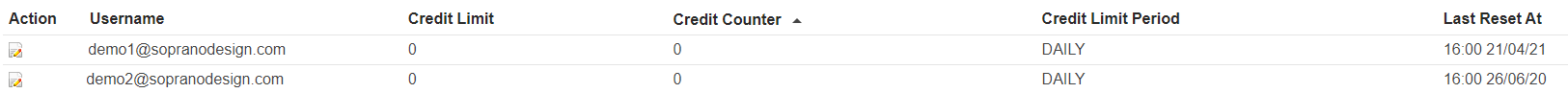'User Credit Control Summary' displays a list of users and their credit limits / time period.x
