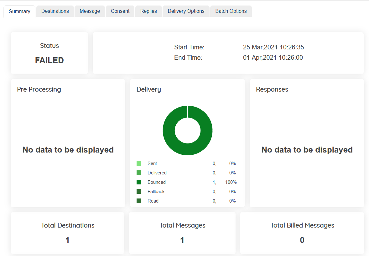 After the Order is launched, the page displays the status of the message along with other critical details.