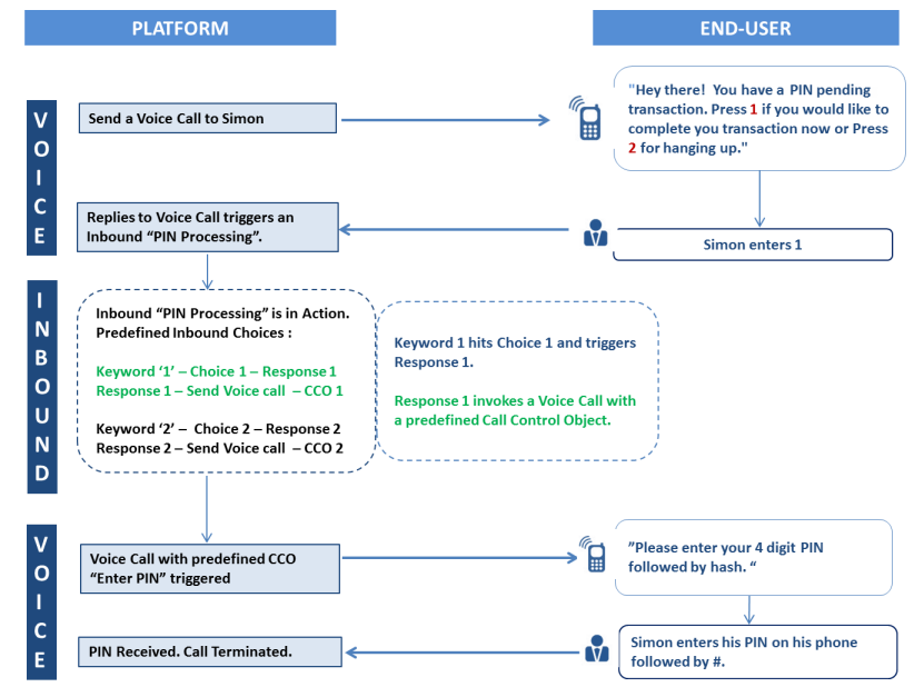Let's look at the below example where we are setting up an IVR to let our end-user Simon complete a PIN pending transaction. We must have access to SOPRANO MEMS Voice & Inbound solution as a prerequisite, in order to generate an automated flow with ease and zero coding effort. We've depicted platform's automated actions on the left and end-user experience on the right side of the below flow. Notice the product being utilised at each step in the left most bar and follow the sequence step-by-step: