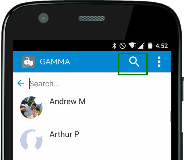Search Contacts - Use the magnifying glass at the top of the screen to bring up the search bar and search for a contact.
