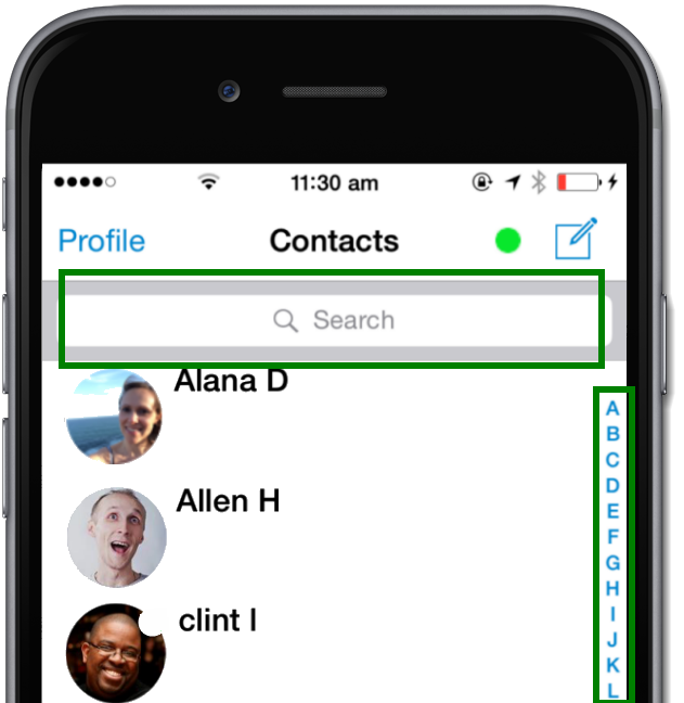 Search Contacts - In the Contacts screen, use the alphabet scroll bar or the search bar at the top of the list to find the contact you're after.