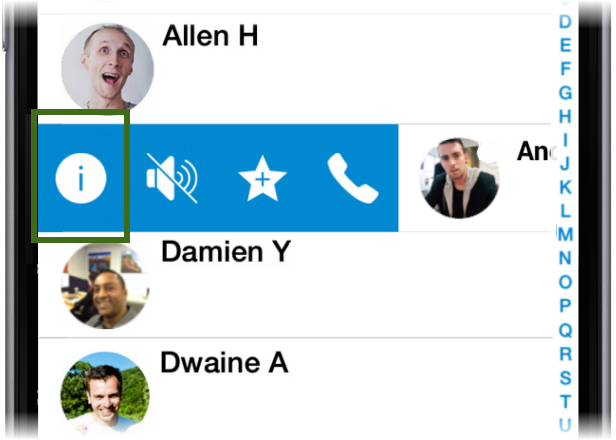 View Contact Details - Once you've located the contact, swipe right to bring up the swipe controls and press the 'i' icon.
